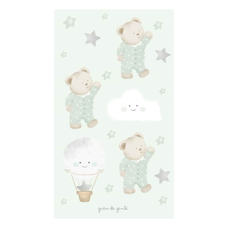 Adesivos de Parede Três Ursinhos, Balão, Nuvem e Estrelas Verde da Grão de Gente: R$ 26,34 no PIX ou R$ 30,99 em até 12x sem juros. Frete grátis acima de R$499. Entrega rastreada com garantia de 7 dias para trocas.