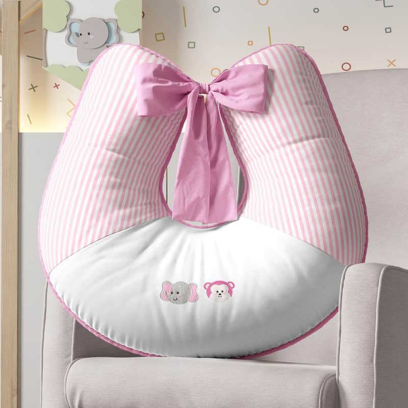 Com o enchimento confortável e o tecido 100% algodão macio proporcionam um toque suave com a pele sensível do bebê. O lacinho bege, tecido listrado e os bordados dos amiguinhos elefantinho e macaquinho garantem mais graciosidade para esse acessório tão funcional.