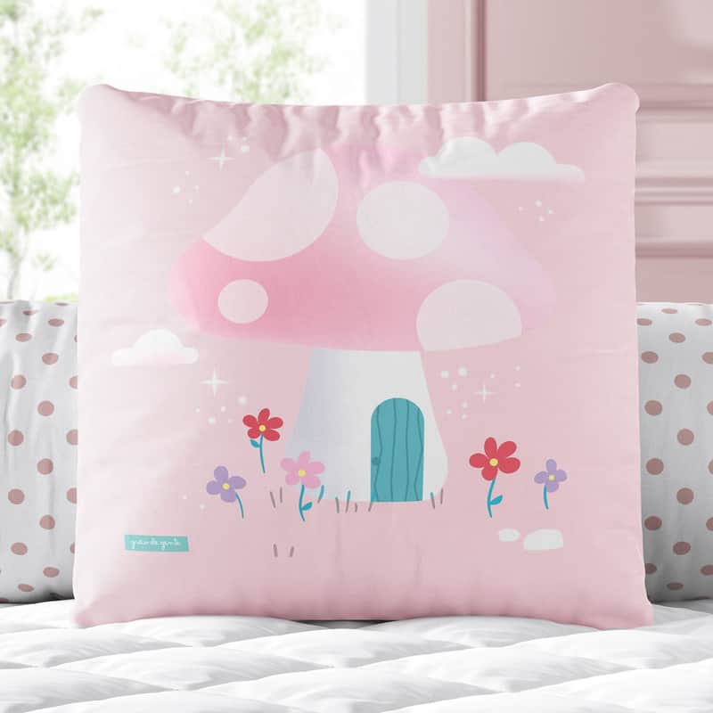 Almofada Quadrada Flor e Casinha Cogumelo Rosa 30cm da Grão de Gente: R$ 28,04 no PIX ou R$ 32,99 em até 12x sem juros. Frete grátis acima de R$499. Entrega rastreada com garantia de 7 dias para trocas.
