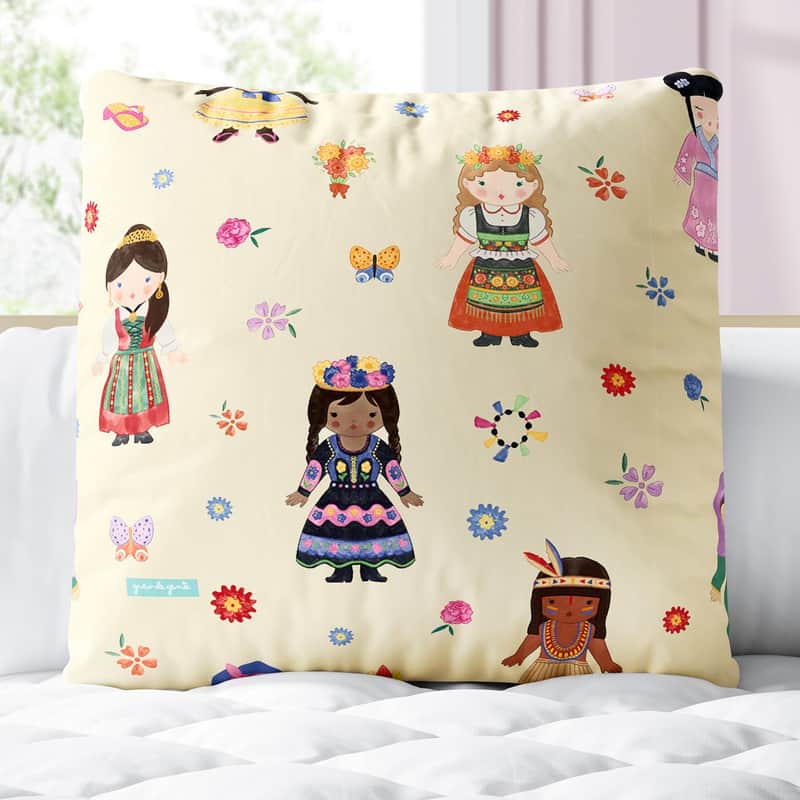 Almofada Quadrada Meninas do Mundo Amarelo da Grão de Gente: R$ 35,69 no PIX ou R$ 41,99 em até 12x sem juros. Frete grátis acima de R$499. Entrega rastreada com garantia de 7 dias para trocas.