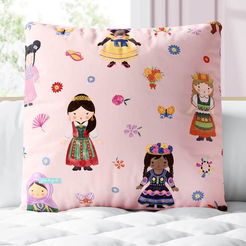 Almofada Quadrada Meninas do Mundo Rosa da Grão de Gente: R$ 28,04 no PIX ou R$ 32,99 em até 12x sem juros. Frete grátis acima de R$499. Entrega rastreada com garantia de 7 dias para trocas.