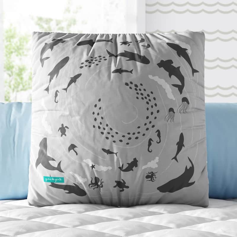 Almofada Quadrada Tubarão no Fundo do Mar Cinza da Grão de Gente: R$ 33,14 no PIX ou R$ 38,99 em até 12x sem juros. Frete grátis acima de R$499. Entrega rastreada com garantia de 7 dias para trocas.