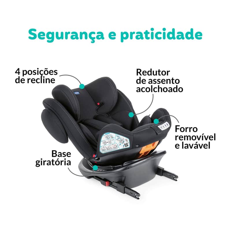 A Cadeirinha de Carro Único Plus Black Chicco é a harmonia perfeita entre conforto, comodidade e segurança. Conta com um redutor de impacto removível para acompanhar o crescimento do seu amor. Seu assento rotativo facilita na hora de colocar e retirar o bebê da cadeira, além disso possui sistema de instalação ISOFIX + Top Tether (grupo 0+) trazendo maior segurança.