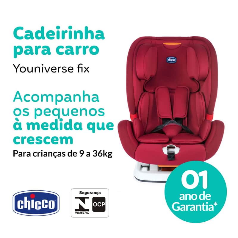 A Cadeirinha de Carro Youniverse Fix Jet Black Chicco acompanha os pequenos desde os 12 meses aos 12 anos, com suas múltiplas regulagens garante conforto e segurança durante todo uso. Para reforçar a segurança, possui cinto de 5 pontos e redutor removível para recém nascido.