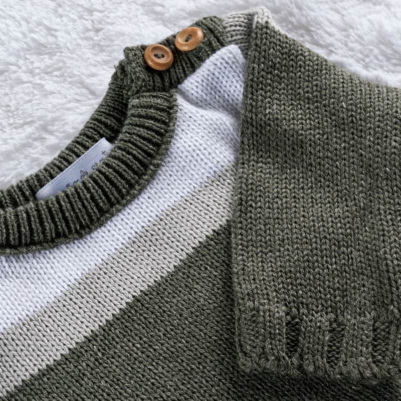 Casaquinho Tricot Listra Verde Musgo e Cinza da Grão de Gente: R$ 136,84 no PIX ou R$ 160,99 em até 12x sem juros. Frete grátis acima de R$499. Entrega rastreada com garantia de 7 dias para trocas.