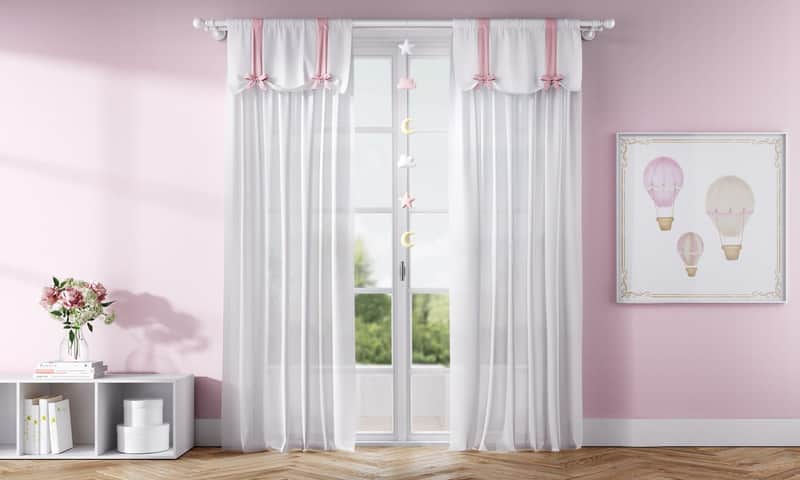 Cortina Branco/Rosa com Laços Poá da Grão de Gente: R$ 157,24 no PIX ou R$ 184,99 em até 12x sem juros. Frete grátis acima de R$499. Entrega rastreada com garantia de 7 dias para trocas.