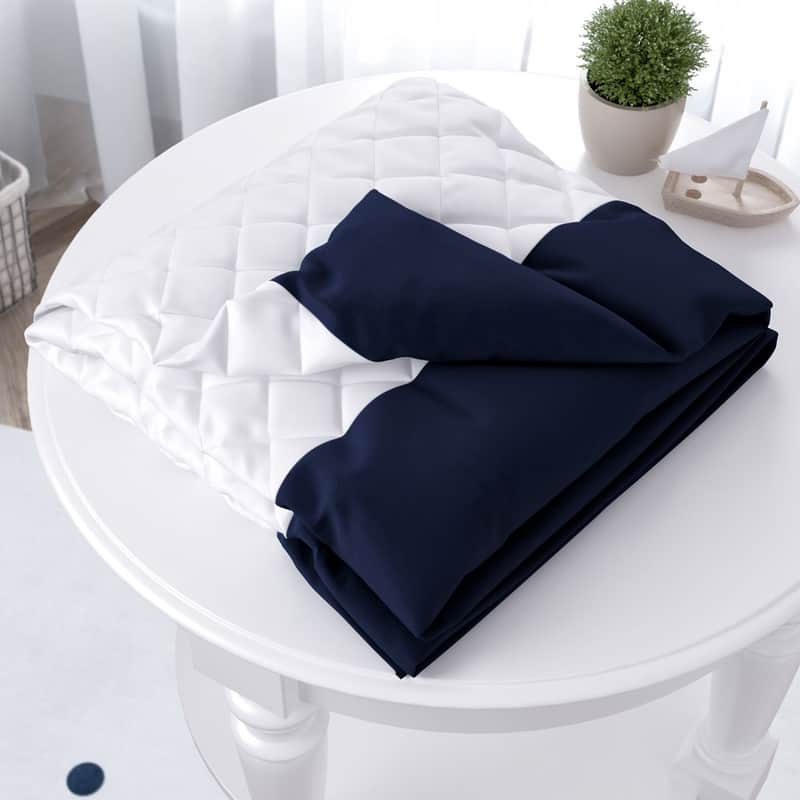 Edredom de Berço Matelado Branco/Azul Marinho da Grão de Gente: R$ 87,54 no PIX ou R$ 102,99 em até 12x sem juros. Frete grátis acima de R$499. Entrega rastreada com garantia de 7 dias para trocas.
