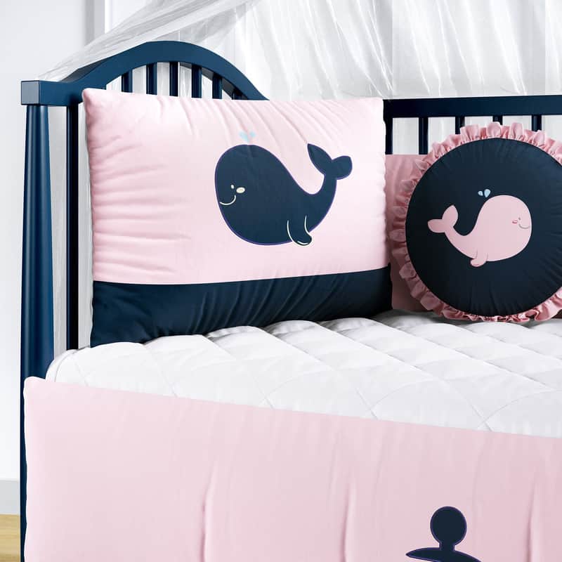 Uma criação exclusiva da Grão de Gente o Kit Berço Baleia Rosa e Marinho traz uma proposta moderna para decorar o quarto de bebê com um dos animais mais fofos do fundo do mar.