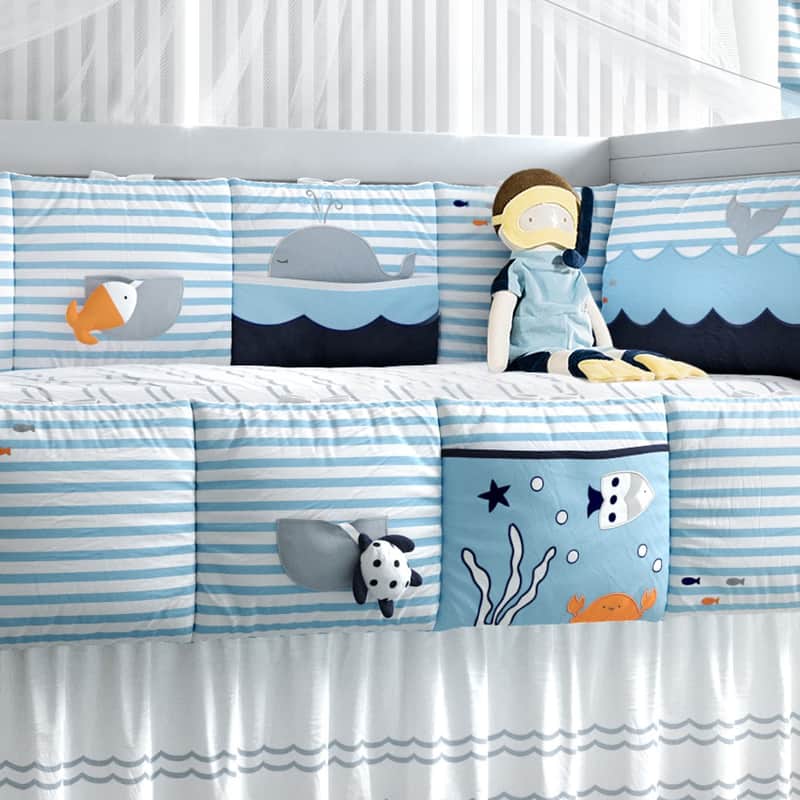 O Kit Berço Fundo do Mar é um convite para o soninho tranquilo depois de muitas brincadeiras! Confeccionado com a suavidade do tecido 100% algodão 180 fios, os protetores laterais de berço têm bordados exclusivos e bolsinhos com um peixinho e uma tartaruga de tecido para entreter o bebê.