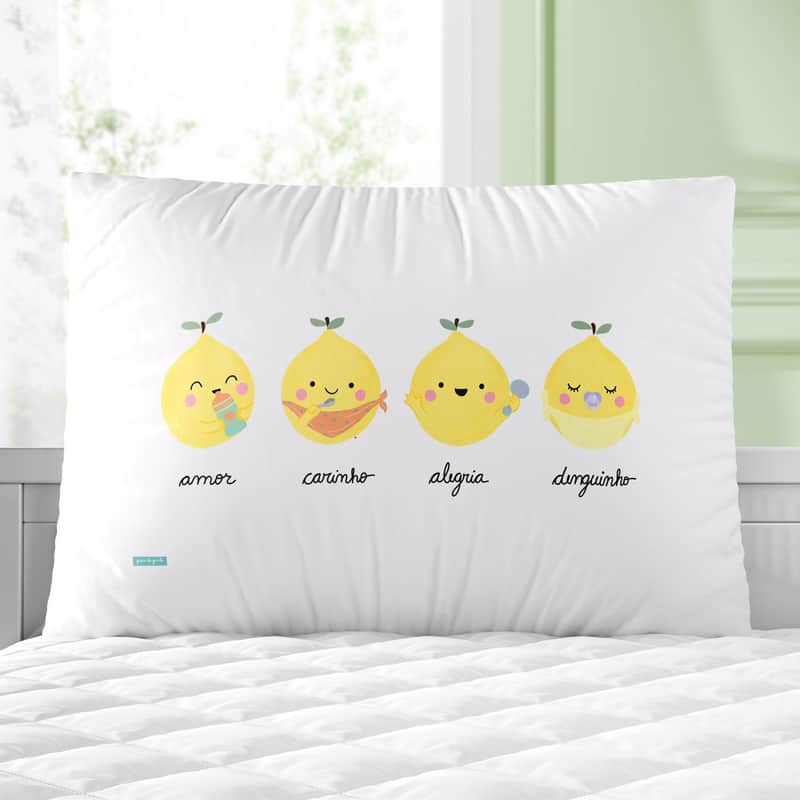 • Cabeceira com estampa exclusiva de limões sicilianos e palavras: amor, carinho, alegria e denguinho