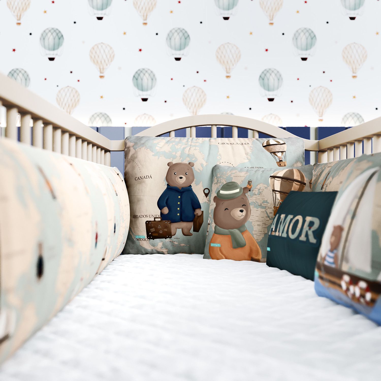 • Protetores laterais com estampa de ursinhos, mapa mundi, balões, barcos e malas