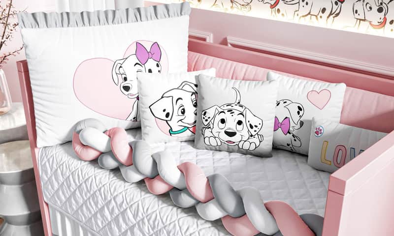 Só a Grão de Gente para trazer o mundo mágico da Disney para a decoração do quarto do seu bebê! O Kit Berço Trança 101 Dálmatas Rosa é um conjunto completo com 10 peças para aconchegar e proteger seu amor. Esse enxoval exclusivo, confeccionado com materiais de qualidade e enchimento fofinho, traz na cabeceira o bordado de uma filhote dos queridos dálmatas Pongo e Perdita. Além disso, já vêm com zíper, para facilitar a lavagem, e amarril, para fixação no berço. Indicado para berços com padrão americano ou nacional.