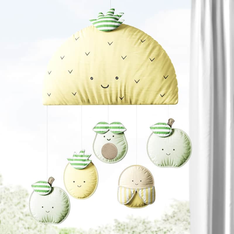 Móbile Abacaxi com 5 Frutinhas Amarelo e Verde da Grão de Gente: R$ 107,94 no PIX ou R$ 126,99 em até 12x sem juros. Frete grátis acima de R$499. Entrega rastreada com garantia de 7 dias para trocas.