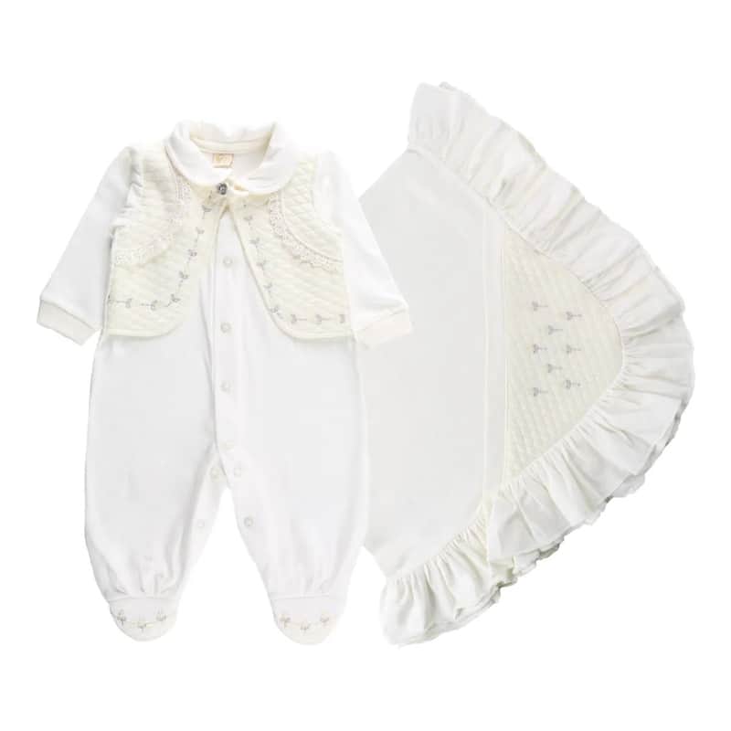 Saída de Maternidade Din Don Detalhe Colete Bordado Flores Off White
