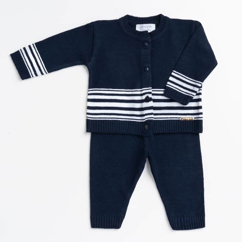 Saída Maternidade Tricot Cardigan e Calça Listras Marinho e Branco 02 Peças