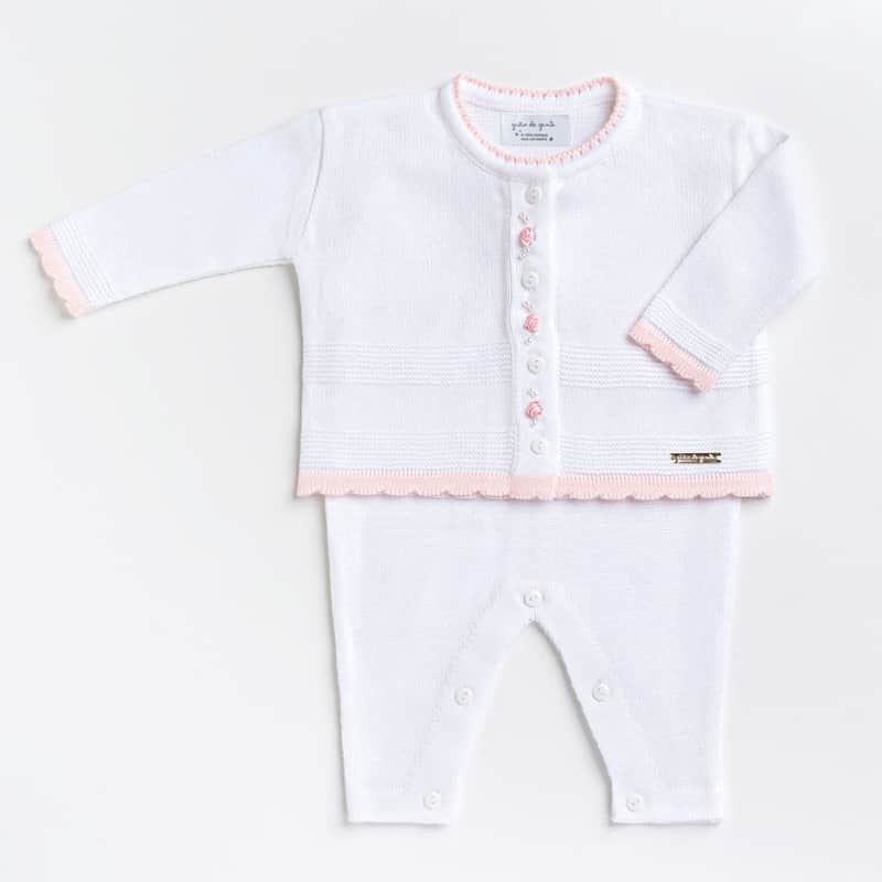 Elegância e muito charme para vestir a sua menina! A Saída Maternidade Tricot Casaquinho Flor Rococó e Macação Branco traz um toque romântico para momentos especiais com a pequena!