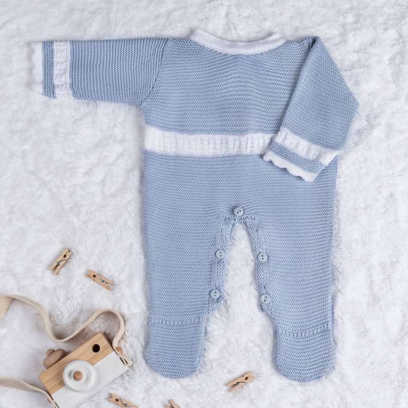 • Macacão manga longa com detalhes em tricot trança branco, abotoamento nas costas e no cós para facilitar as trocas de fraldas.
