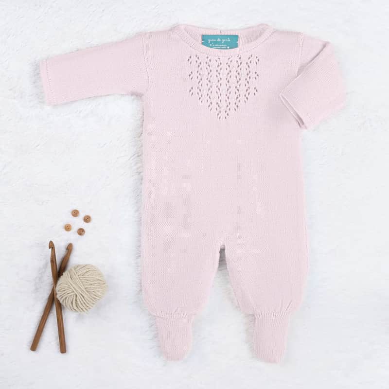 • Macacão manga longa de tricot com pézinhos, mini pérolas bordadas na frente, abotoamento nas costas e no cós para facilitar as trocas de fraldas