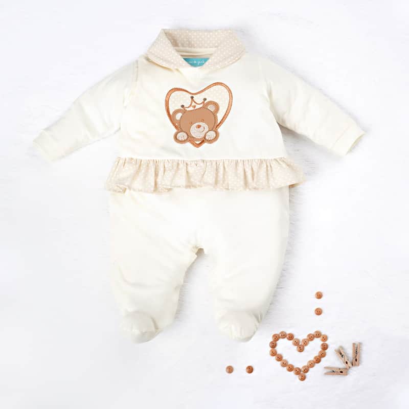 • Macacão manga longa com bordado de ursinha, gola bebê com estampa poá, babadinhos na cintura e pézinhos