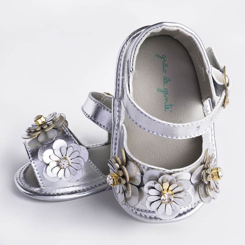 Sandália de Bebê Margaridas e Strass Prata Tam 15 da Grão de Gente: R$ 39,09 no PIX ou R$ 45,99 em até 12x sem juros. Frete grátis acima de R$499. Entrega rastreada com garantia de 7 dias para trocas.